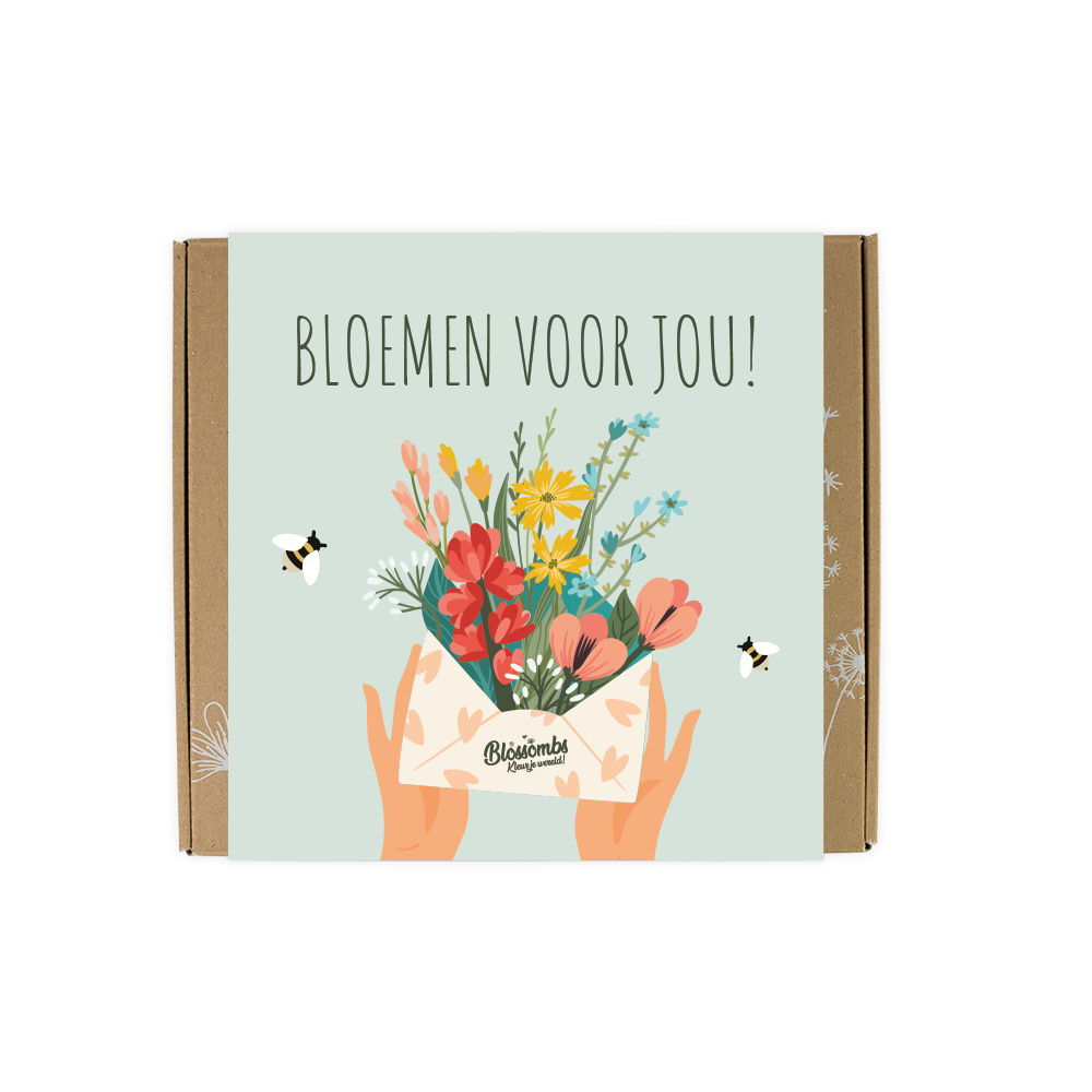 De Blossombs cadeauset Medium is ideaal om te geven bij een verjaardag, bedankje, moederdag of zomaar als fleurige verrassing. De verpakking past in de brievenbus en ziet er prachtig uit – met een vrolijk bloemenpatroon en de tekst “Bloemen voor jou!”.