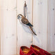 De noordelijke kardinale schoenlepel is een handgesneden en realistisch gebeeldhouwde houten vogel, waar de staartveren de eigenlijke schoenlepel vormen.De noordelijke kardinaal is een kleurrijke zangvogel uit het oosten van de Verenigde Staten die zich heeft verspreid van de zuidelijke staten tot het uiterste noorden tot aan de Canadese grens. Het nestelt bijna overal, zolang er struiken in de buurt zijn. Het mannetje is erg territoriaal en verdedigt zijn territorium met zowel zang als agressie, maar tijdens de paartijd laat hij zijn zachtere kant zien door het vrouwtje na te streven en haar te voeden.