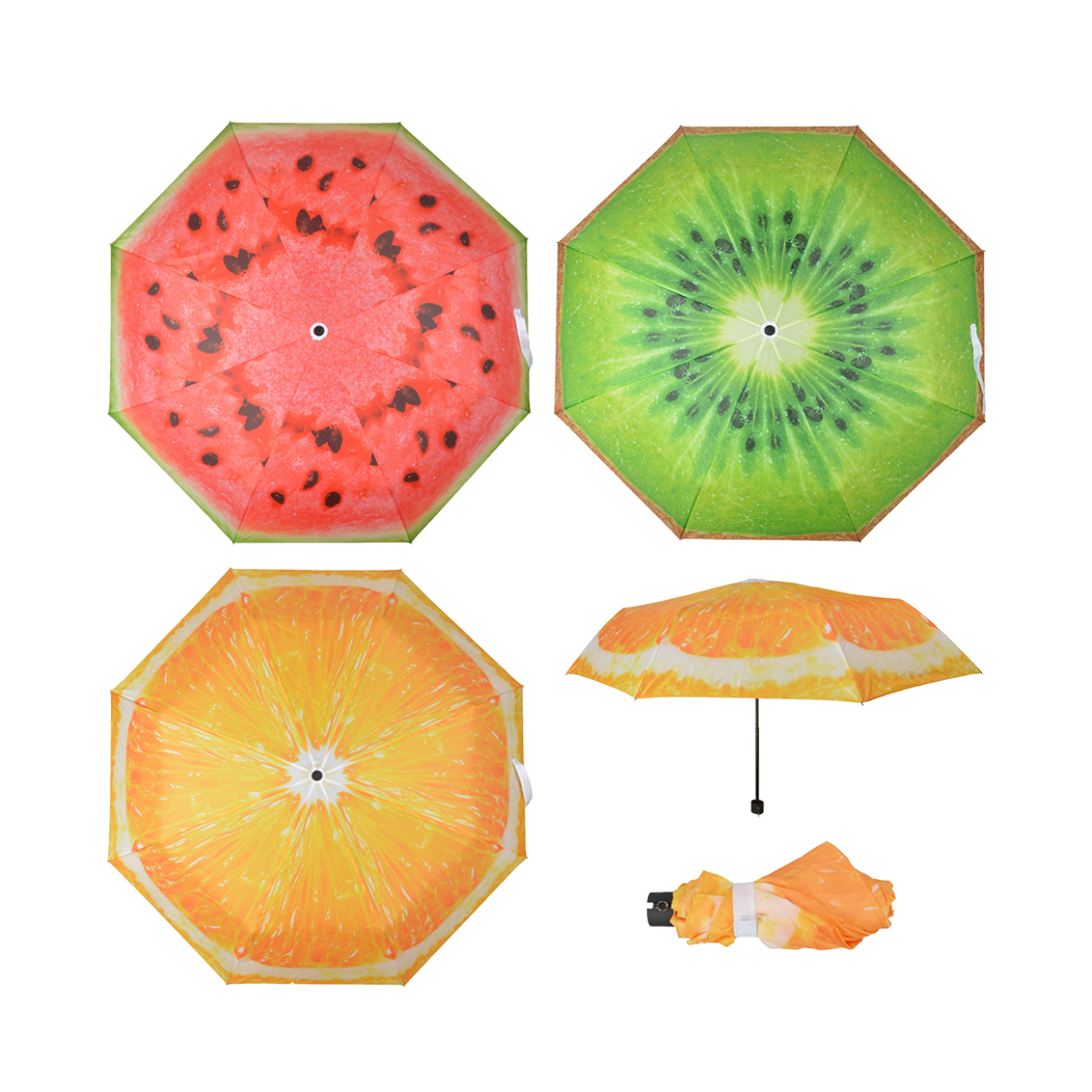 Opvouwbare paraplu met print van fruit. Assorti van 3; meloen, kiwi en sinaasappel Let op: Prijs is per stuk