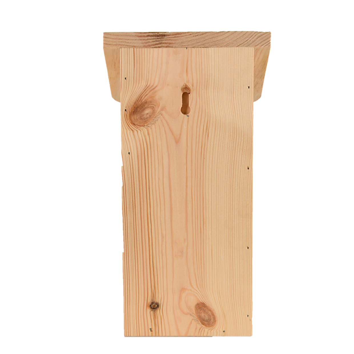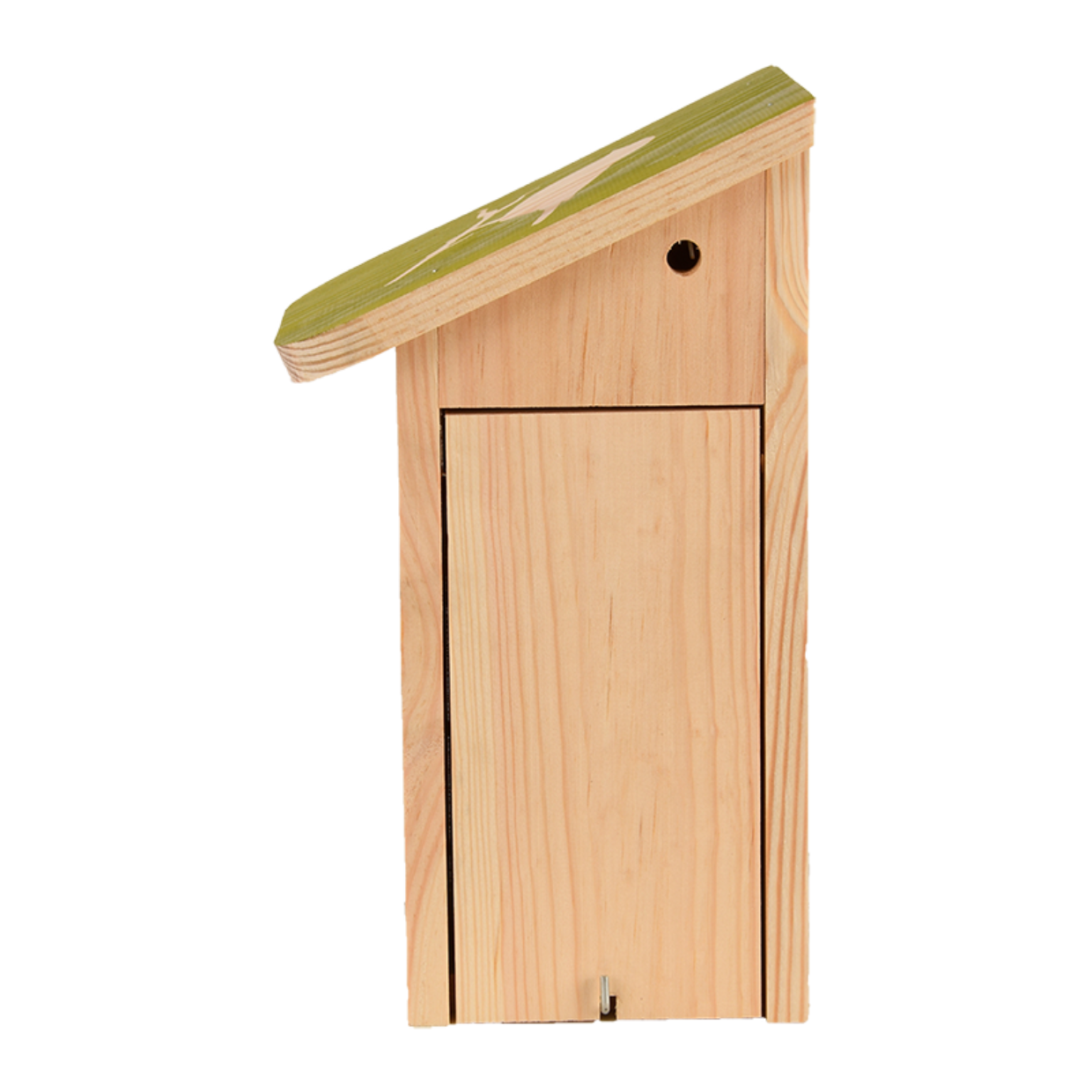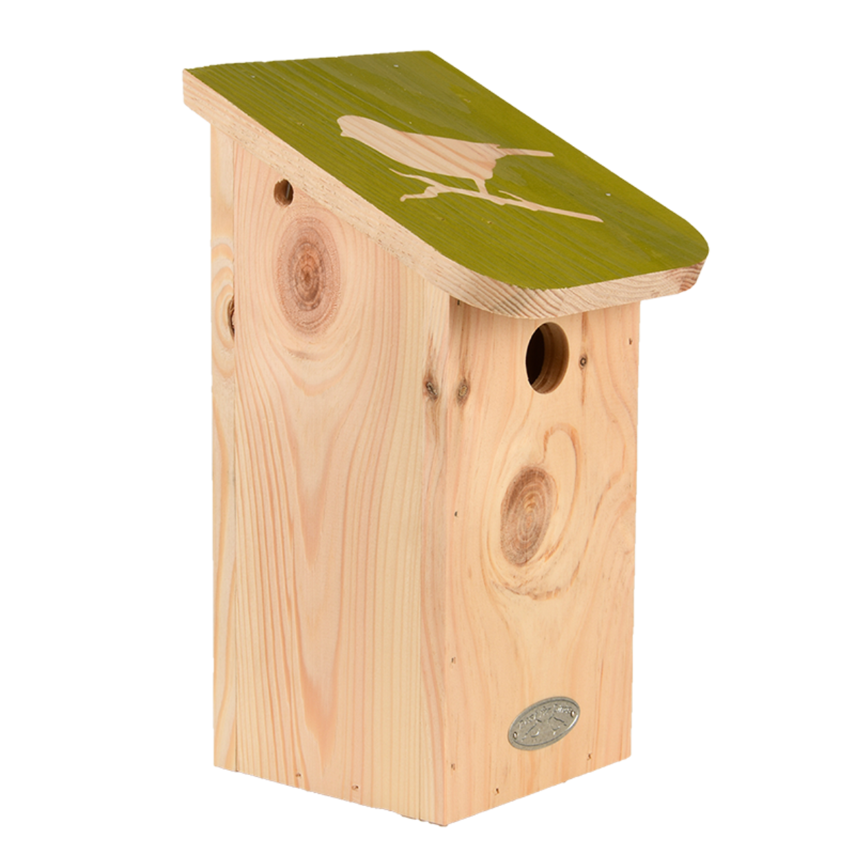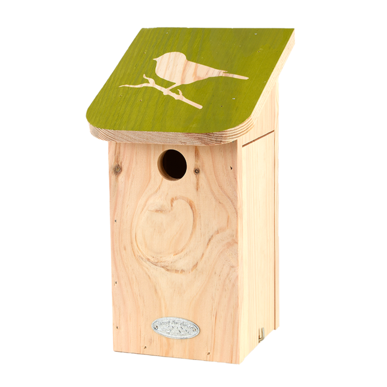 Deze nestkast met vrolijk gekleurd dak en een diapositief silhouet is ontworpen voor de pimpelmees. Het biedt niet alleen de pimpelmees, maar ook de kuifmees, glanskop, matkop en zwarte mees een goede plek om te nestelen. Tijdens strenge winterse omstandigheden biedt de nestkast beschutting en bescherming.