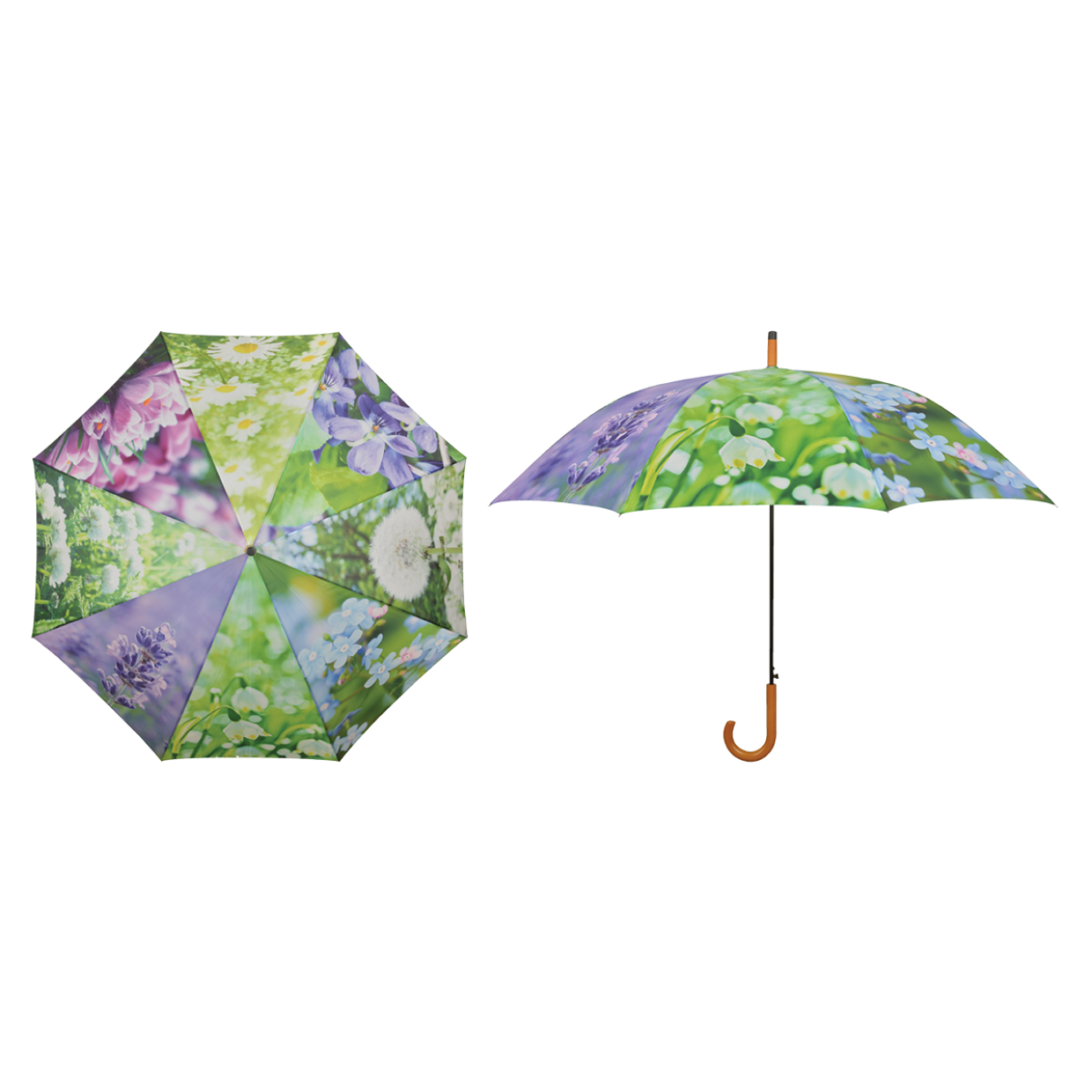 Avec ce parapluie imprimé photo, même une promenade sous la pluie est un plaisir. L'impression comprend huit fleurs différentes : marguerites, violettes, pissenlits, myosotis, cloches de printemps, lavande, trèfle et crocus.