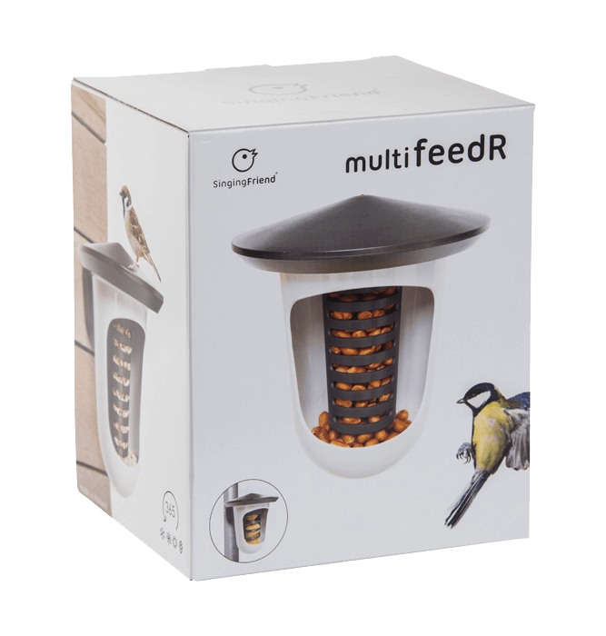 Le Multi feedR est conçu de telle manière qu'il peut accueillir de nombreux types d'alimentation différents ; des boules de graisse aux cacahuètes et aux graines de tournesol. Ce produit est disponible dans une variété de couleurs, y compris le vert sauvage. Avec les deux silos différents, vous pouvez facilement varier la nourriture pour oiseaux.