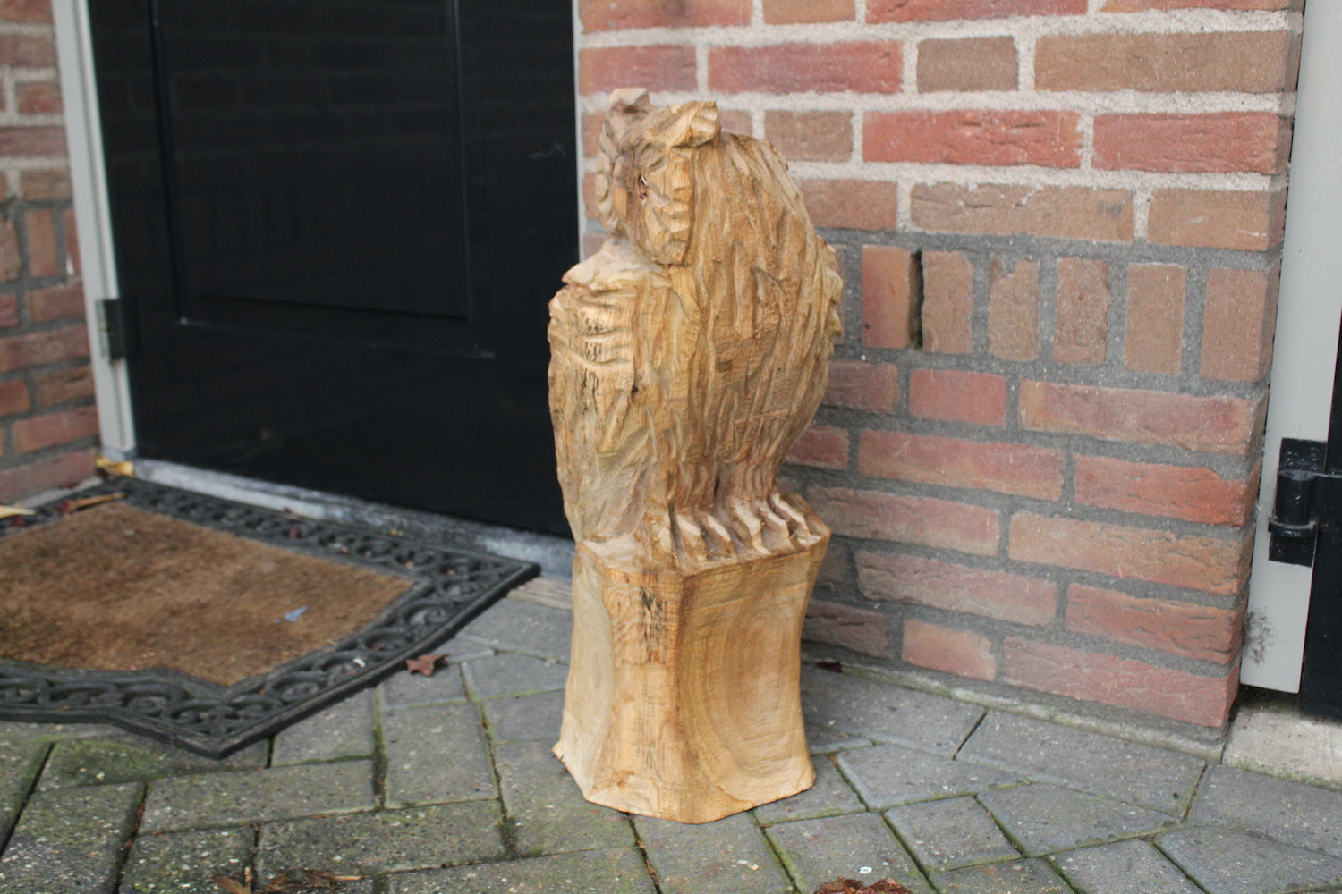 Hibou en bois sculpté, artisanat exclusif, scié à partir d'un tronc de chêne. Robuste / unique / spécial. Une image dans chaque jardin !