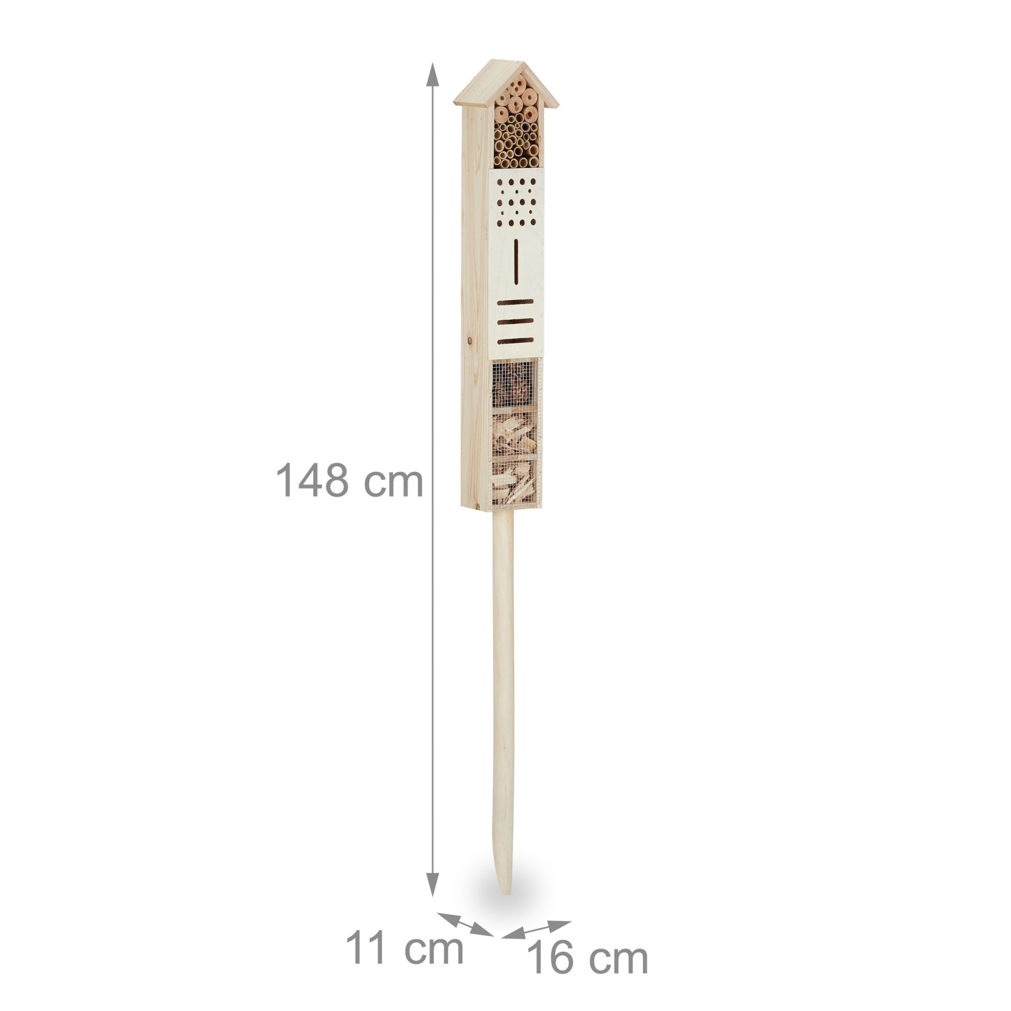 Le piquet facilite l'insertion de ce magnifique nichoir dans le sol de votre jardin. Proposez des sources de nourriture adaptées aux besoins naturels des insectes, comme des fleurs sauvages et des herbes, pour attirer papillons, coccinelles ou abeilles. L'hôtel à abeilles comprend plusieurs sites de nidification fabriqués à partir de différents matériaux, comme des pommes de pin, de la sciure et des tiges de bambou creuses. Ce nichoir est amusant à observer, tant pour les adultes que pour les enfants, et il est également éducatif.
