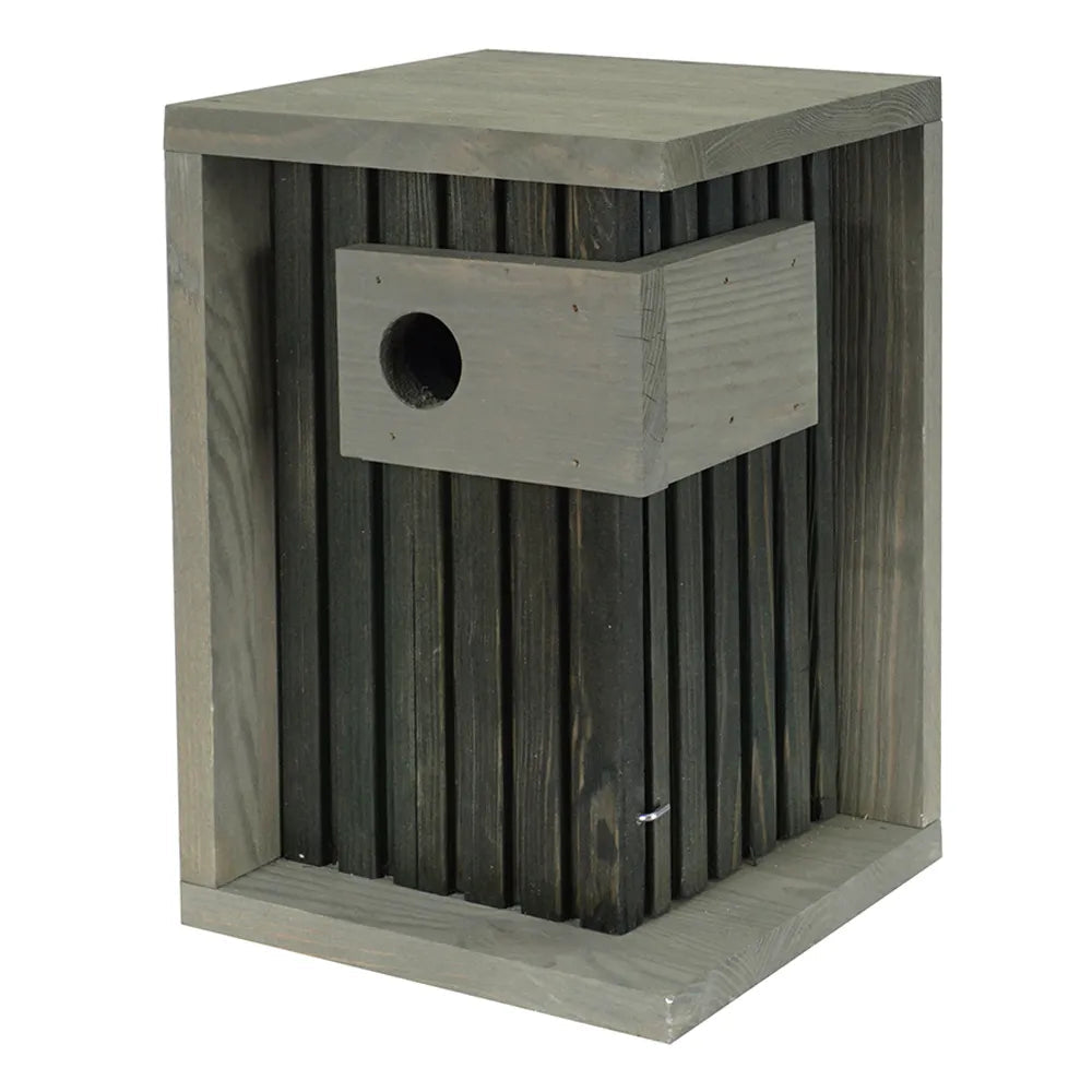 Nichoir cubique bicolore en pin. Bois traité par trempage avec une lasure non toxique à base d'eau. Parois avant et latérales décoratives rainurées. Entrée à double paroi pour une meilleure protection contre les prédateurs. Paroi latérale ouvrante pour un nettoyage facile. Trou d'entrée de 32 mm.