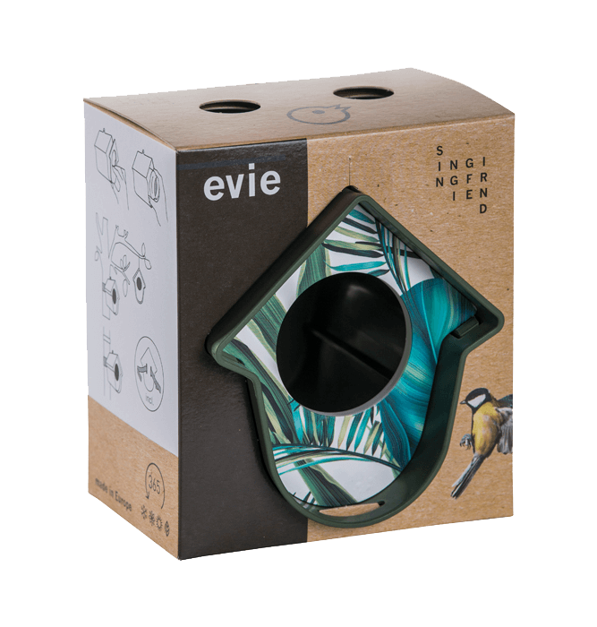 "Salut, je suis Evie!" J'aimerais vous dire quelque chose à propos de moi. Je suis un détenteur de pot de beurre de cacahuète, mais juste un peu différent. Les oiseaux m'aiment quand il y a quelque chose de doux en moi. Vous pouvez mettre à la fois des grands et des petits pots en moi en enlevant simplement la façade en bois, en y plaçant le pot et en appuyant sur la partie avant. Tu aides le plus les oiseaux si tu m'apportes du beurre de cacahuète spécial oiseau. Le beurre de cacahuète ordinaire est beaucoup trop salé. Mais vous pouvez aussi mettre d'autres aliments pour oiseaux en moi. Pensez à une boule de graisse, des cacahuètes ou des graines de tournesol. Vous pouvez même mettre une demi-pomme en moi rapidement et facilement.Ce qui est également très pratique chez moi, c'est que vous pouvez m'accrocher à de nombreux endroits de votre jardin ou de votre balcon. Au moyen du velcro fourni ou avec une vis, vous pouvez facilement me fixer, par exemple, à un tuyau d'évacuation, une clôture horizontale ou verticale ou un mur. Mais tu peux aussi choisir un autre endroit agréable pour moi, car je me glisse presque partout. Honnêtement, je pense que je suis plutôt jolie. J'ai de belles lignes et vous pouvez également choisir dans quelle couleur vous me voulez. Je suis disponible en pas moins de 6 coloris différents. De cette façon, vous pouvez choisir la couleur qui vous convient le mieux. Evie, c'est mon nom. N'oubliez pas !