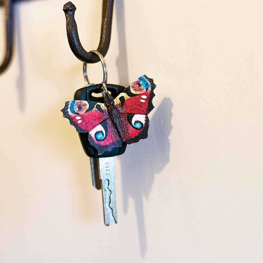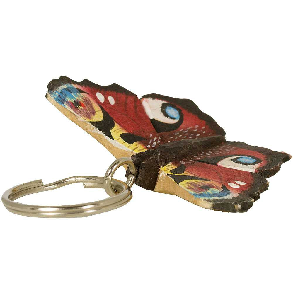 Un porte-clés amusant et pratique qui aide à organiser vos clés. Le papillon est sculpté à la main dans une seule pièce de bois et peint à la main en utilisant uniquement des peintures respectueuses de l'environnement. Il est attaché à un anneau en métal.