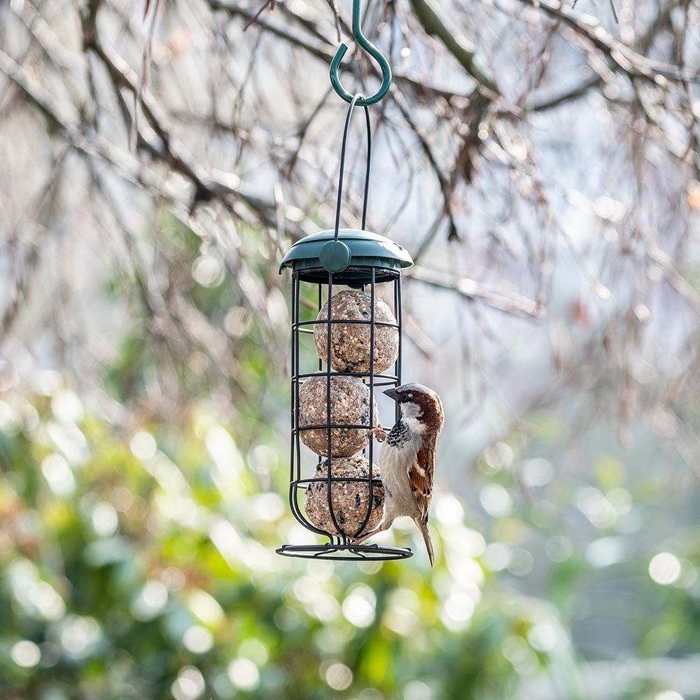 Ce support à boules de suif en plastique peut contenir trois boules de suif, vous permettant d'offrir cette friandise aux oiseaux en toute sécurité.