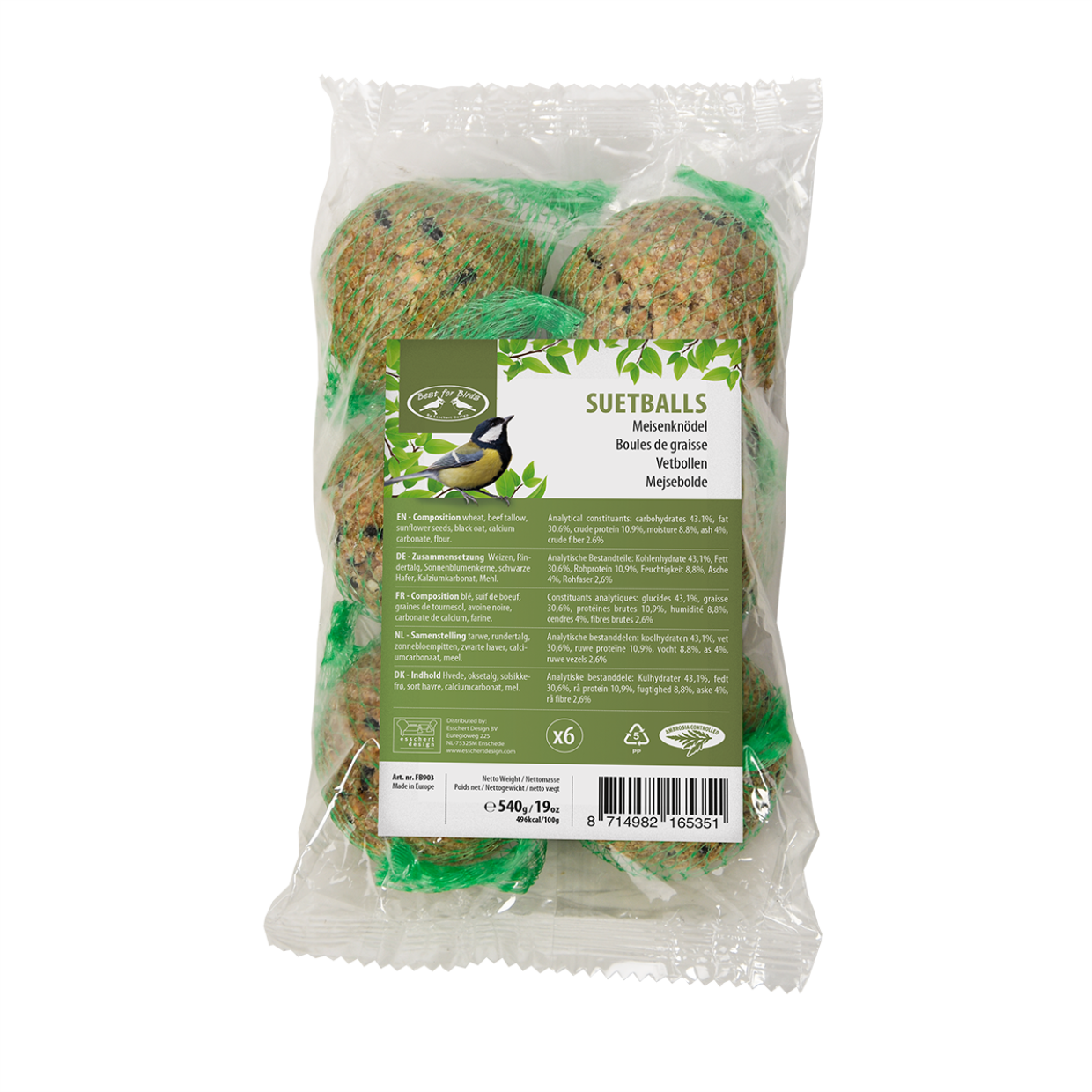 - Suif de bœuf, blé, maïs, sorgho, graines de tournesol rayées, carbonate de calcium