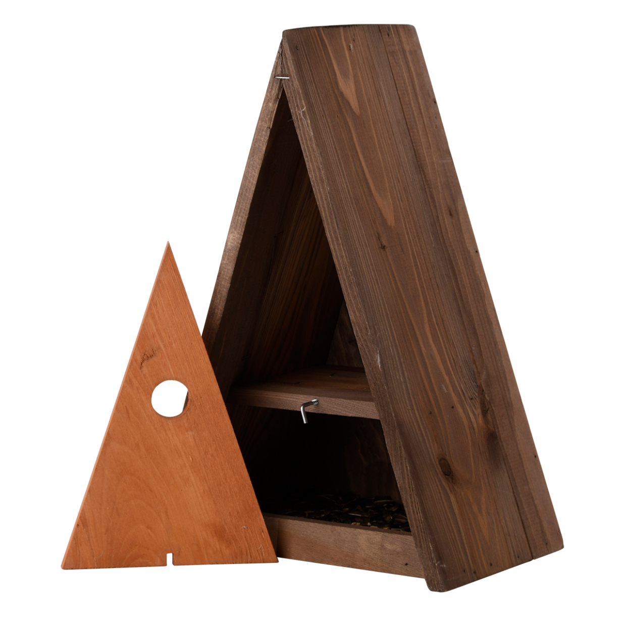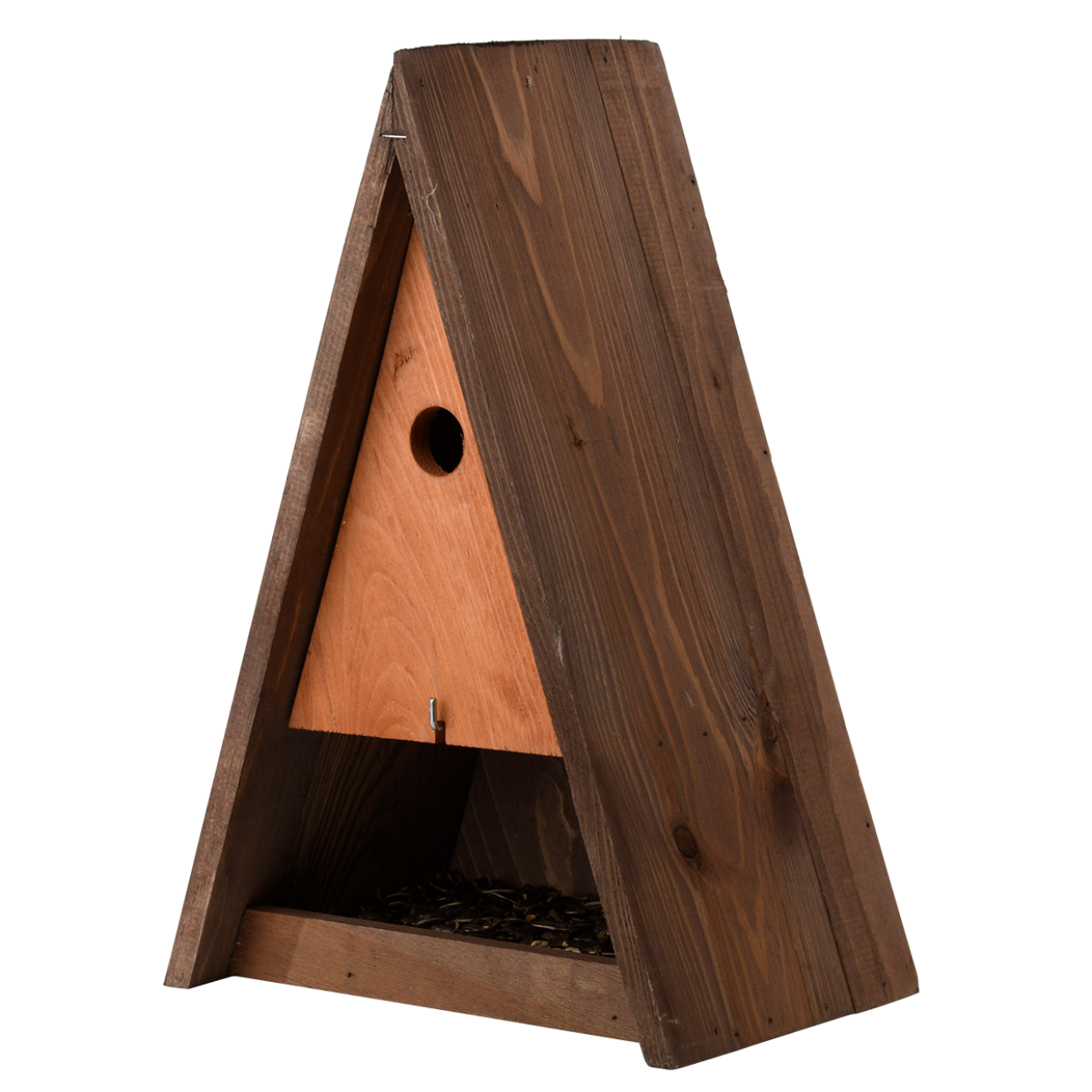 In geen enkele tuin mag een nestkast en voederplek ontbreken. Deze driehoekige combi nestkast in bruin tinten biedt de Pimpelmees een goede plek om in te nesten en om populaties van deze vogelsoort te behouden of weer terug te krijgen in een gebied. De op maat gemaakte nestkast biedt niet alleen de Pimpelmees maar ook de Kuifmees, Glanskop, Matkop en Zwarte Mees een goede plek om in te nesten. In de winter bewijst de nestkast vaak een goede dienst voor de vogels om te schuilen tegen het slechte weer.