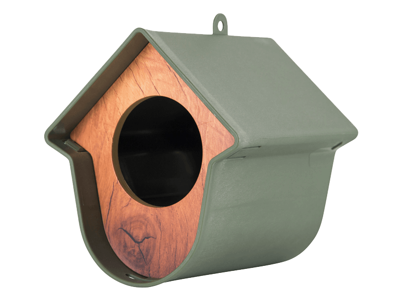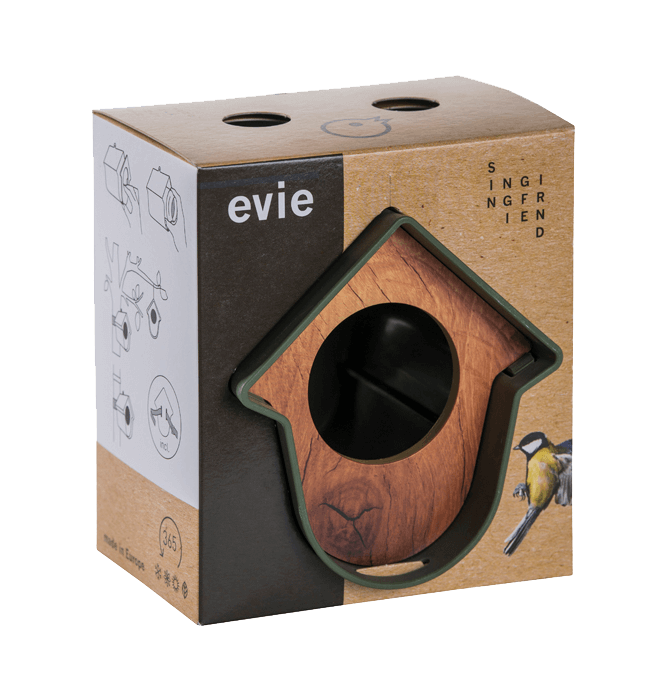 “Hallo, ik ben Evie!” Graag vertel ik iets over mezelf.Ik ben een pindakaaspothouder, maar dan net even anders. De vogels zijn dol op mij als er iets lekkers in me ligt. Zowel grote als kleine potten kun je in me kwijt door simpelweg het houten frontje te verwijderen, de pot erin te leggen en het frontje er weer op te drukken. De vogels help je het meest als je speciale vogelpindakaas voor me haalt. Gewone pindakaas is veel te zout. Maar je kunt ook ander voedsel voor vogels in me leggen. Denk aan een vetbol, pinda’s of zonnepitten. Zelfs een halve appel leg je snel en makkelijk in mij.Wat ook heel handig is aan mij is dat je me op heel veel plekken in je tuin of balkon kan hangen. Door middel van het bijgeleverde klittenband of met een schroef bevestig je me makkelijk aan bijvoorbeeld een regenpijp, horizontale- of verticale schutting of een muur. Maar je kan ook een ander leuk plekje voor me uitkiezen, want ik pas bijna overal. Eerlijk gezegd vind ik dat ik er best leuk uitzie. Ik heb mooie lijnen en je kunt ook nog eens kiezen in welke kleur je me wilt. Ik ben er in maar liefst 6 verschillende kleuren. Zo kan je de kleur kiezen die het beste bij je past. Evie, dat is mijn naam. Niet vergeten hè!