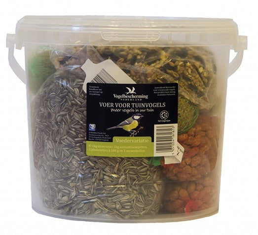 Vogelbescherming Nederland Voedervariatie emmer bevat 1 kg strooivoer, 1 kg zonnebloempitten, twee pindanetjes á 200 gr en drie vetbollen á 90 gr.